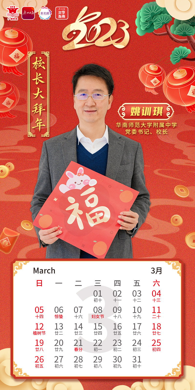 2023年是我们全面学习贯彻落实党的二十大精神、迈向建设教育强国新征程的开局之年,是华附建校135周年,也是承办“广东奥林匹克学校”30周年。新的一年,华附将聚焦“拔尖创新人才早期培养”这一时代新命题,引领华附学子树立更远大的抱负,迸发更强的信心与勇气,持续提升思维力、创新力和动手实践能力,初中进一步落实“减负增效”,高中持续推进新课程新教材改革,为广东乃至全国进行拔尖创新人才自主培养提供华附样本和方案。新的一年,华附将聚焦“华附知识城校区”建设,开启学校集团化发展2.0版,为广州孩子提供更多更优质的学位,以优异的办学成绩迎接135周年校庆。