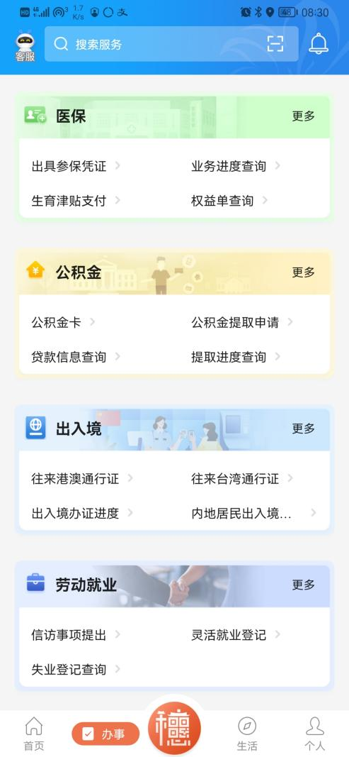 Step1:打开“穗好办”APP办事页面,进入“出入境”专区,点击“内地居民业务预约”;