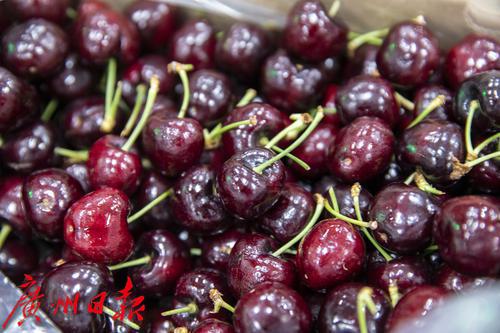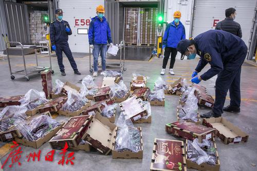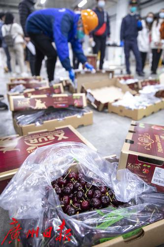 工作人员检验从南美智利运抵的车厘子。
