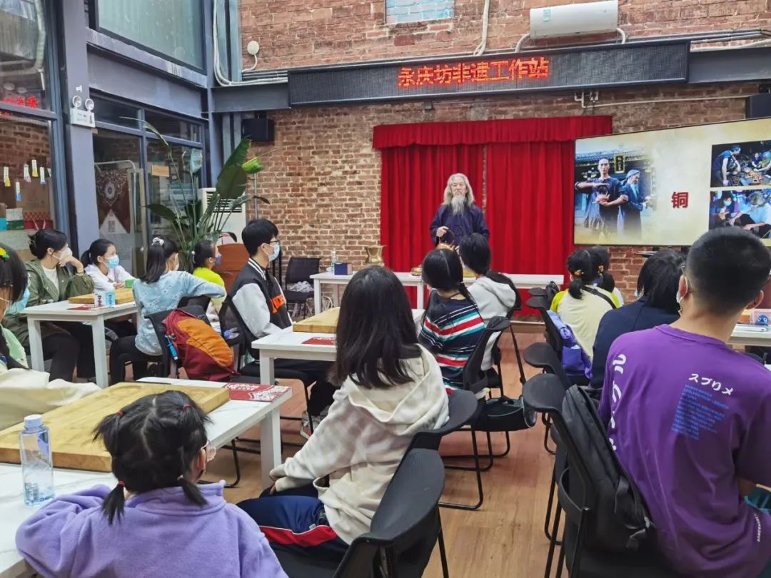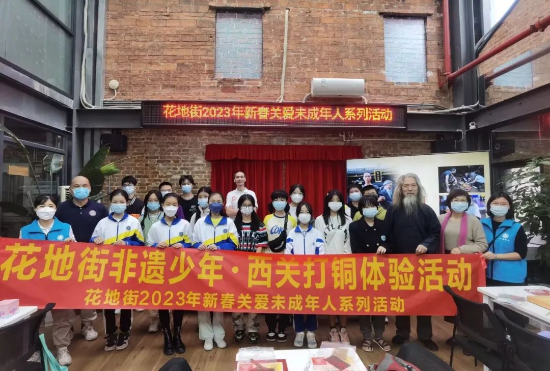近日,荔湾区花地街道未成年人保护站携手花地街社工服务站,举办花地街2023年新春关爱未成年人系列活动。1月14日,在荔湾非遗体验中心内,20名花地青少年参与了“非遗少年·西关打铜体验活动”,花地街道办事处副主任、未成年人保护站站长谢妍现场为参加活动的青少年送上祝福与勉励。
