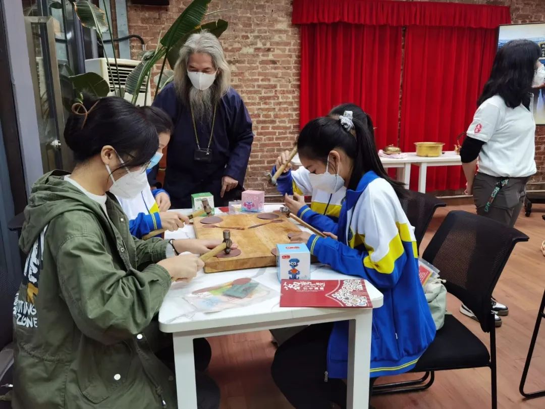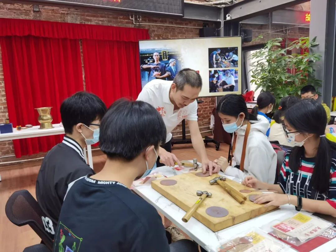 本次活动邀请了广东省非物质文化遗产项目西关打铜代表性传承人苏英敏,带领青少年体验打铜的艺术之美。活动开始,苏老师向大家介绍了西关打铜的历史、打铜的步骤和基础知识,并结合自身与打铜的传承故事鼓励青少年要积极乐观面对学习与生活,科学创新传承西关手艺。