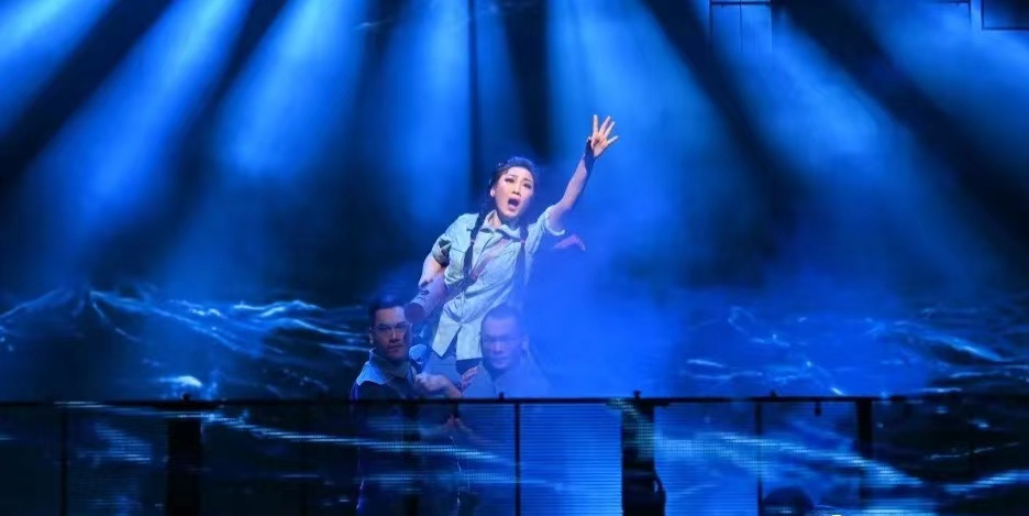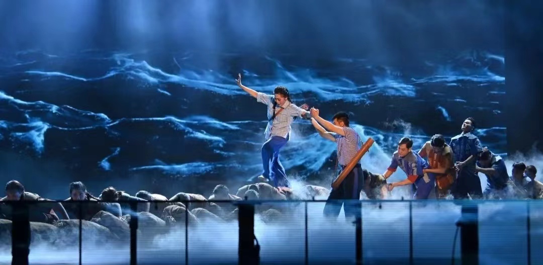 粤剧《东江紫荆红》以“水”贯穿全剧,舞美上也以“水”作为题眼——“洪水”“水库水”“泪水”“汗水”“心中的流水”等,以变化的“水”、多样的“水”,引领人物的奋斗历程,展现人物在不同事件中的思想纠葛和复杂深沉的感情。通过对“水”的艺术处理,用少量象征性元素表现大体量的景物,不仅充满了现代感,且渲染了整部剧的基调,呈现出一场关于生命与水的宏大叙事,一场令人震撼的视听盛宴。