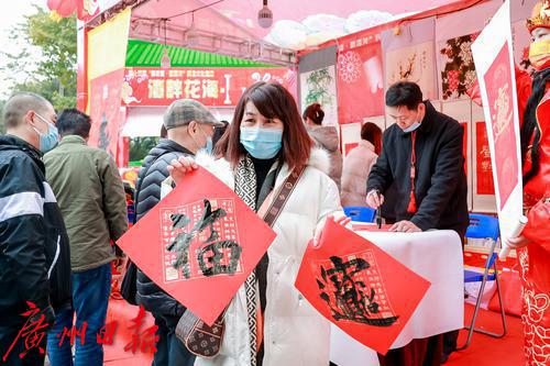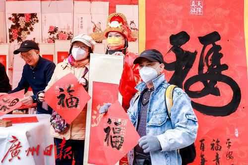 年俗集市上书法家为市民游客送“福”。