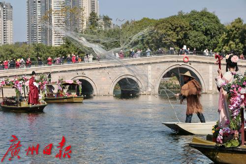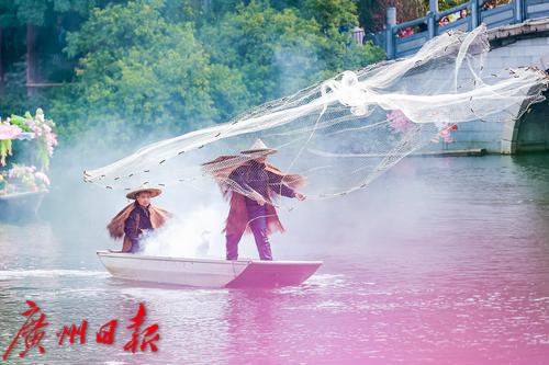 网红主播身穿汉服乘坐花舫在荔湾湖水面巡游,渔民捕鱼的场景也在此重现。