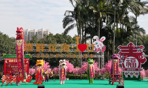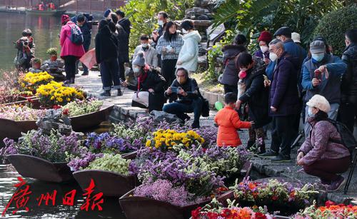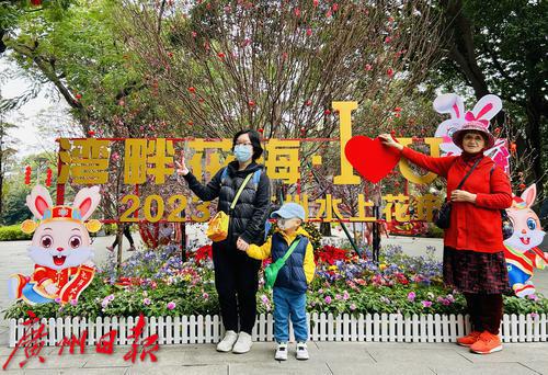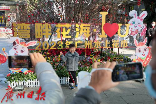 荔湾湖公园“湾畔花海•I LOVE YOU 免—2023年广州水上花市”现场市民游客在拍照留影。