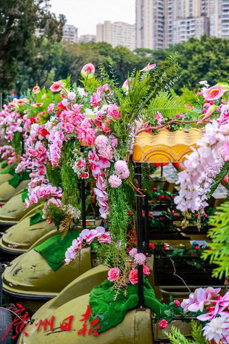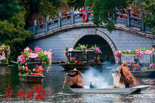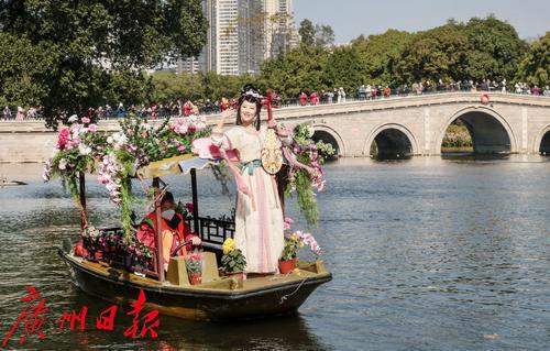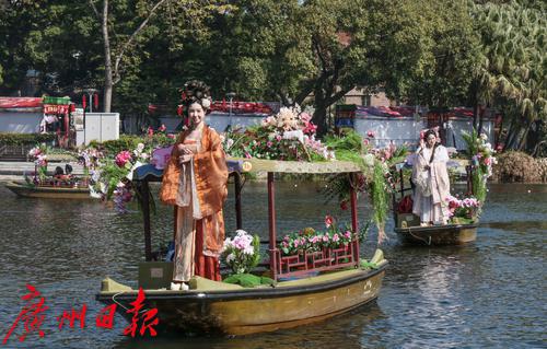 花艇在荔湾湖中巡游,吸引了岸上大量的游人围观拍照。