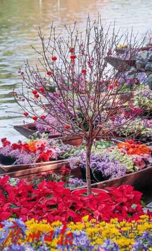 一株桃花矗立在花艇之上,配以各种年花营造出红红火火的过年气氛。