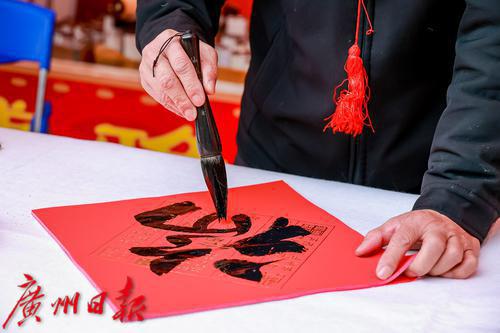 年俗集市上一名书法家正在为市民游客写“福”字。
