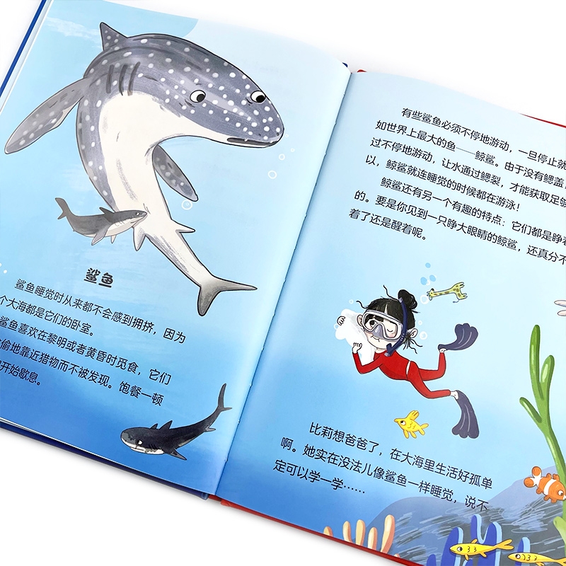 作者通过比莉丰富的想象向小读者们生动活泼地介绍了蝙蝠、蜗牛、鲨鱼、水獭、熊、长颈鹿、斑马、海象、鸭子、欧洲鼬和青蛙等动物的睡觉姿态和习惯。这些空中飞的、水里游的、地上跑的动物们,由于不同的生活环境以及个体差异,它们的睡觉姿态和习惯也大不相同。例如,昼伏夜出的蝙蝠是倒挂着睡觉的,并且它们还喜欢和同伴一起呼呼大睡;世界上最大的鱼鲸鲨,睡觉时不仅要睁着眼睛,还要不停地游动;世界上最高的陆地动物长颈鹿,每天顶多睡两个小时,有时候一次睡五分钟就够了。这些生动趣味的知识内容,不仅能满足小读者们的好奇心,还能帮助他们开阔眼界。