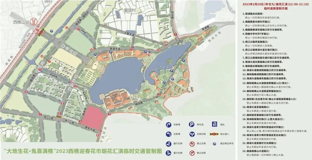 据介绍,1月20日(年廿九)将于西樵镇听音湖片区,组织“大地生花·兔喜满樵——2023西樵迎春花市焰火燃放活动” ,为保障广大人民群众生命财产安全,最大限度降低活动对周边区域交通影响,确保现场交通安全秩序,当晚20:30-21:30对锦湖路、樵园路、白云路等听音湖周边路段,实行临时交通管制 (详见临时交通管制图)。请广大市民听从现场交警指挥,遵守秩序。具体管制时间会根据实际交通状况适时调整,请以现场交警指挥为准。