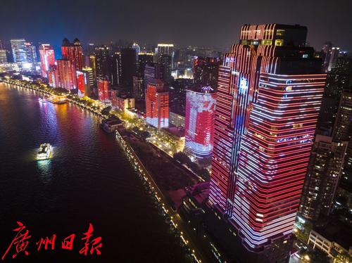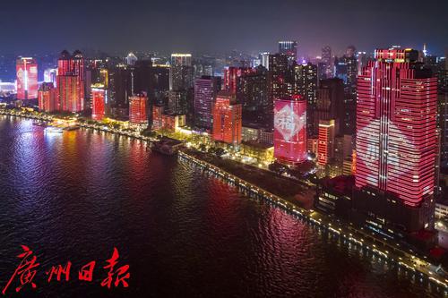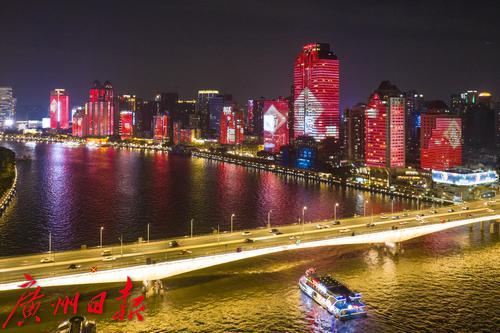 夜幕下,一栋栋闪耀着中国红的建筑让广州充满年味。