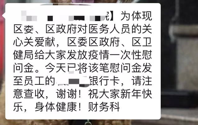 一位已经收到慰问金医护工作者和记者称,这一笔慰问金今日通过了医院财务打入自己的工资卡中,同时还收到了一条短信,上面写着:“为体现区委、区政府对医务人员的关心关爱,区委区政府、区卫健局给大家发放疫情一次性慰问金。请注意查收,祝大家新年快乐,身体健康。”