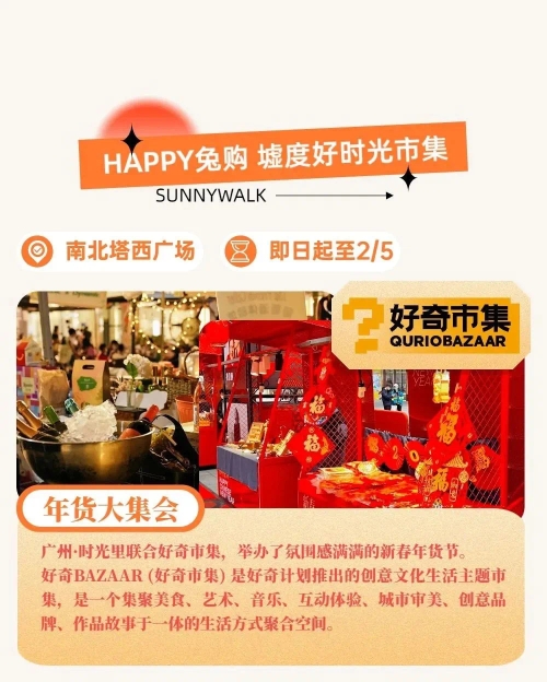 广州·时光里联合好奇市集,举办氛围感满满的新春年货节。主题市集集聚美食、艺术、音乐、互动体验、城市审美、创意品牌、作品故事于一体的生活方式聚合空间。