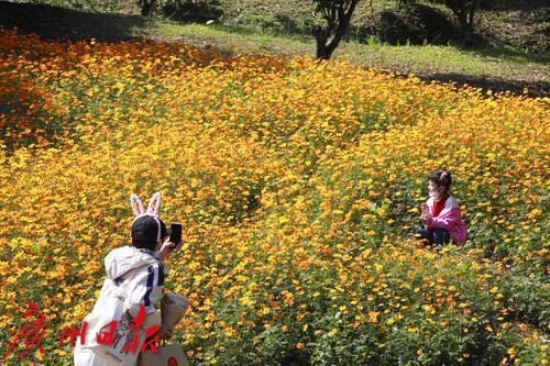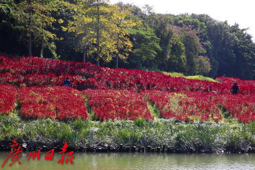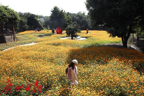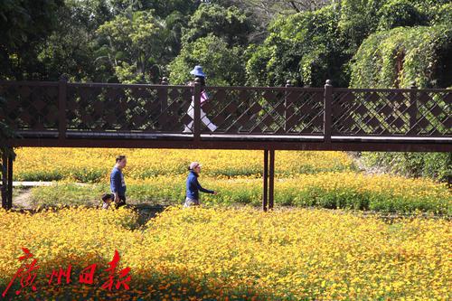 新春将至,花城处处繁花盛放。海珠湿地公园的福寿果廊,一片8000平方的硫华菊正处于盛放期,金黄色的花瓣在绿油油的树林里显得尤其突出,游人争相拍照留影。而在飞龙桥边的都市田园还有一片面积达20000平方米的鸡冠花,远看一片红红火火。另外,海珠湖公园的花畔塔影,20000平方米的波斯菊和百日草也同时盛开,花期可持续到元宵节。1月19日至21日,海珠湿地迎春赏花集市正在湿地牌坊广场举行,在广州过年的市民和游客朋友,不妨在行过花街之后,再到花海里感受一下新春的喜庆。