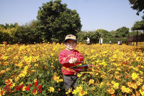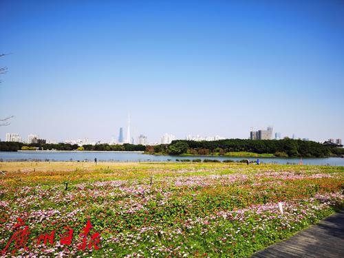 海珠湖公园的花畔塔影,20000平方米的波斯菊和百日草也同时盛开