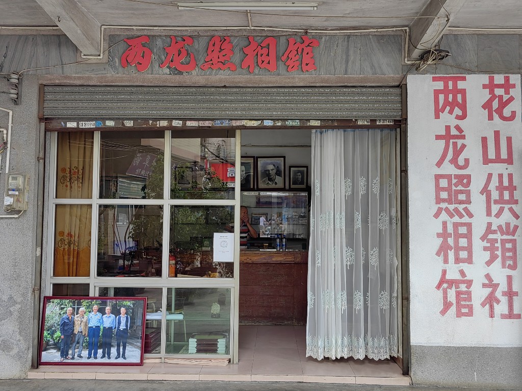 约莫十五分钟时间,工作人员便带领记者来到了两龙墟的旧址。狭窄的街道、不太平整的地面、两侧斑驳墙壁,无声地向人们诉说昔日这里的忙碌热闹的景象。在古街道的入口处,静静地矗立着一家“两龙照相馆”,灰底红字,右侧店铺墙上还刷着“两龙照相馆花山供销社”字样,走进照相馆,一张张泛黄的黑白老照片陈列其中,让人仿佛穿越时空,感受数十年前花山的独特景象。