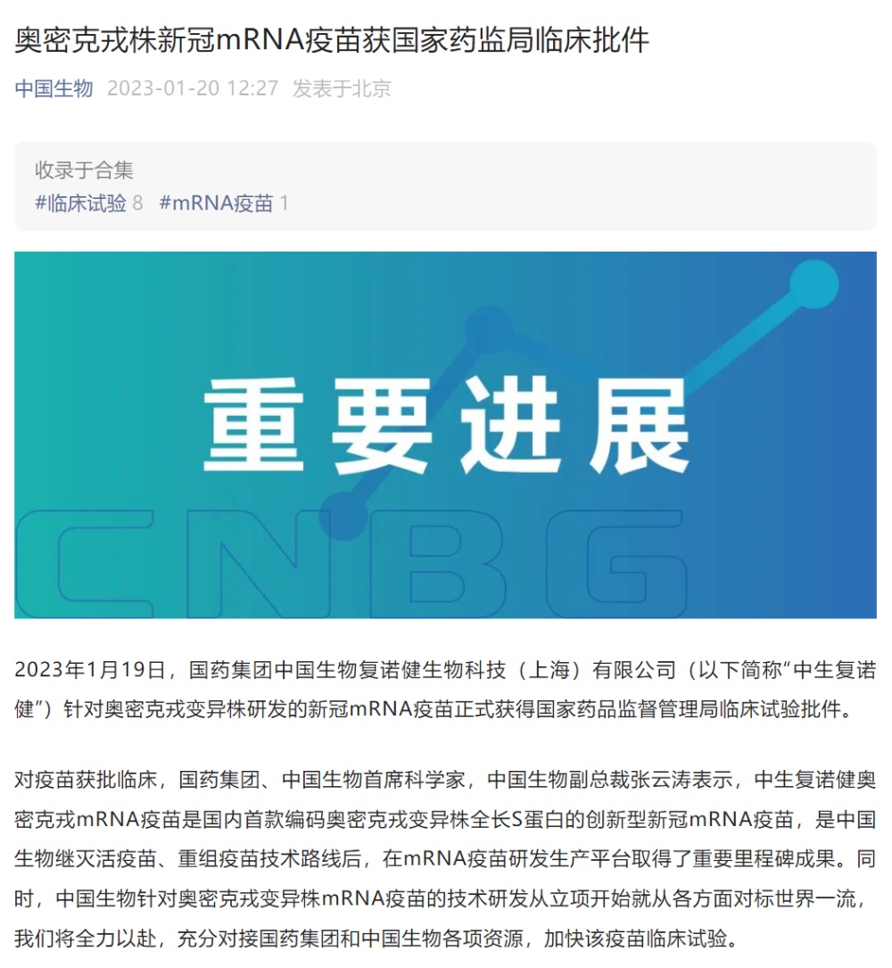 2023年1月19日,国药集团中国生物复诺健生物科技(上海)有限公司(以下简称“中生复诺健”)针对奥密克戎变异株研发的新冠mRNA疫苗正式获得国家药品监督管理局临床试验批件。