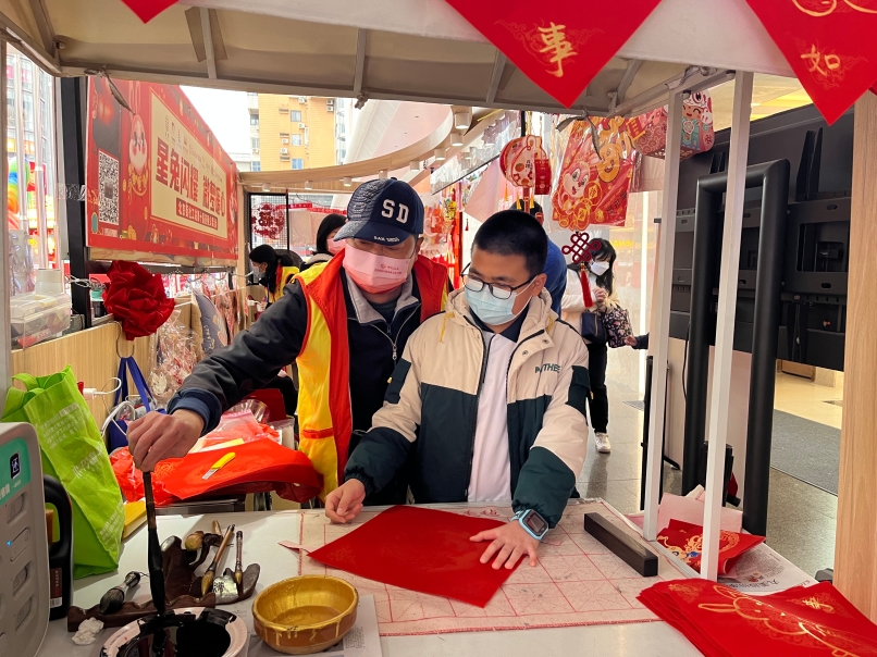 记者在现场看到,此次迎春义卖现场精彩纷呈,宣传摊位岗、书法义卖岗的志愿者们热情高涨,书法志愿者现场邀请小朋友握笔写下“福”字,以寓意着福气满满,福伴家园。