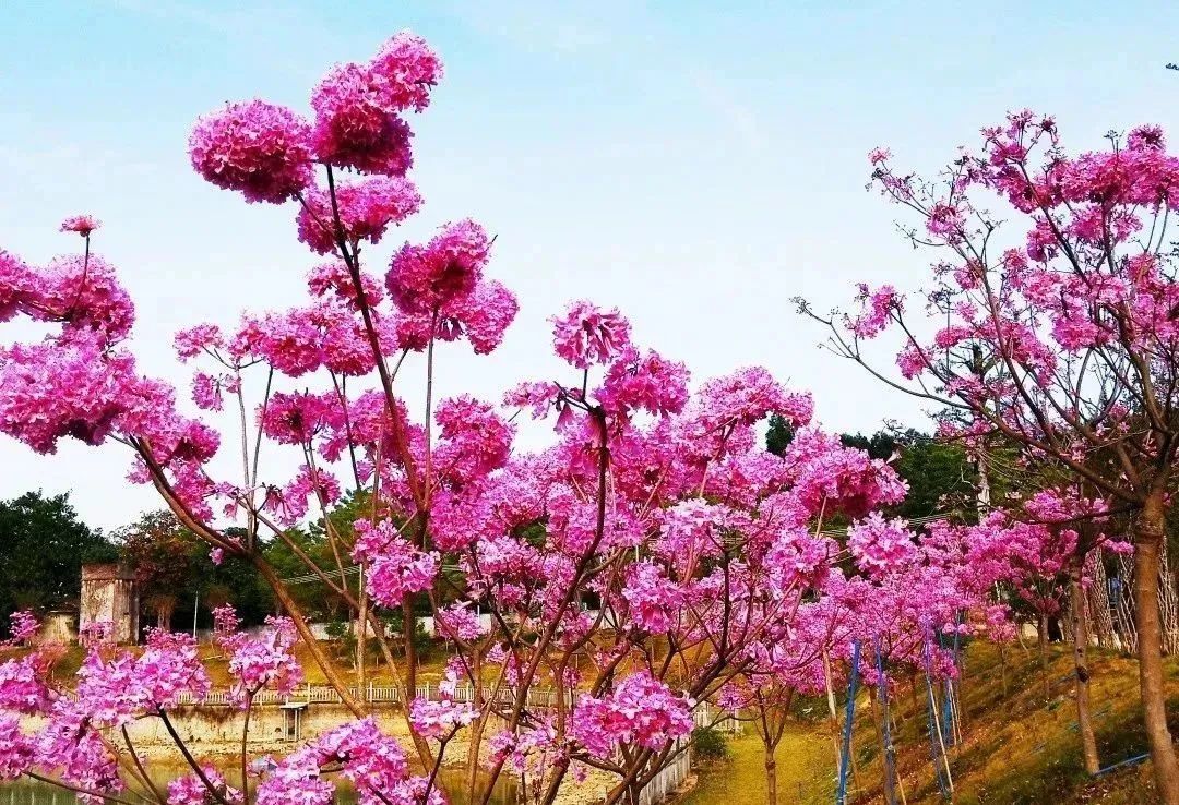 在赤坭荷溪生态湖畔。沿湖碧道上100多棵盛开的紫色风铃花,远观,如大家闺秀,风姿妙曼;近赏,如小家碧玉,与湖水相依,紫气东来。在这里你还可以品尝到浓浓乡土风味的农家私房菜和一幅春意盎然的美景。