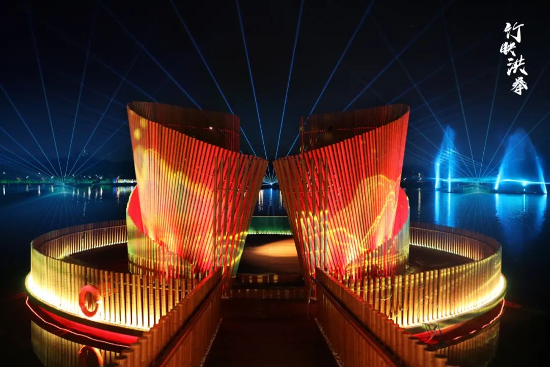 灯光秀分为:《水幕光影演艺·竹映洪拳》《观澜·冥想台》《竹洞游廊》《明月竹风》给你不一样的乡村游体验!
