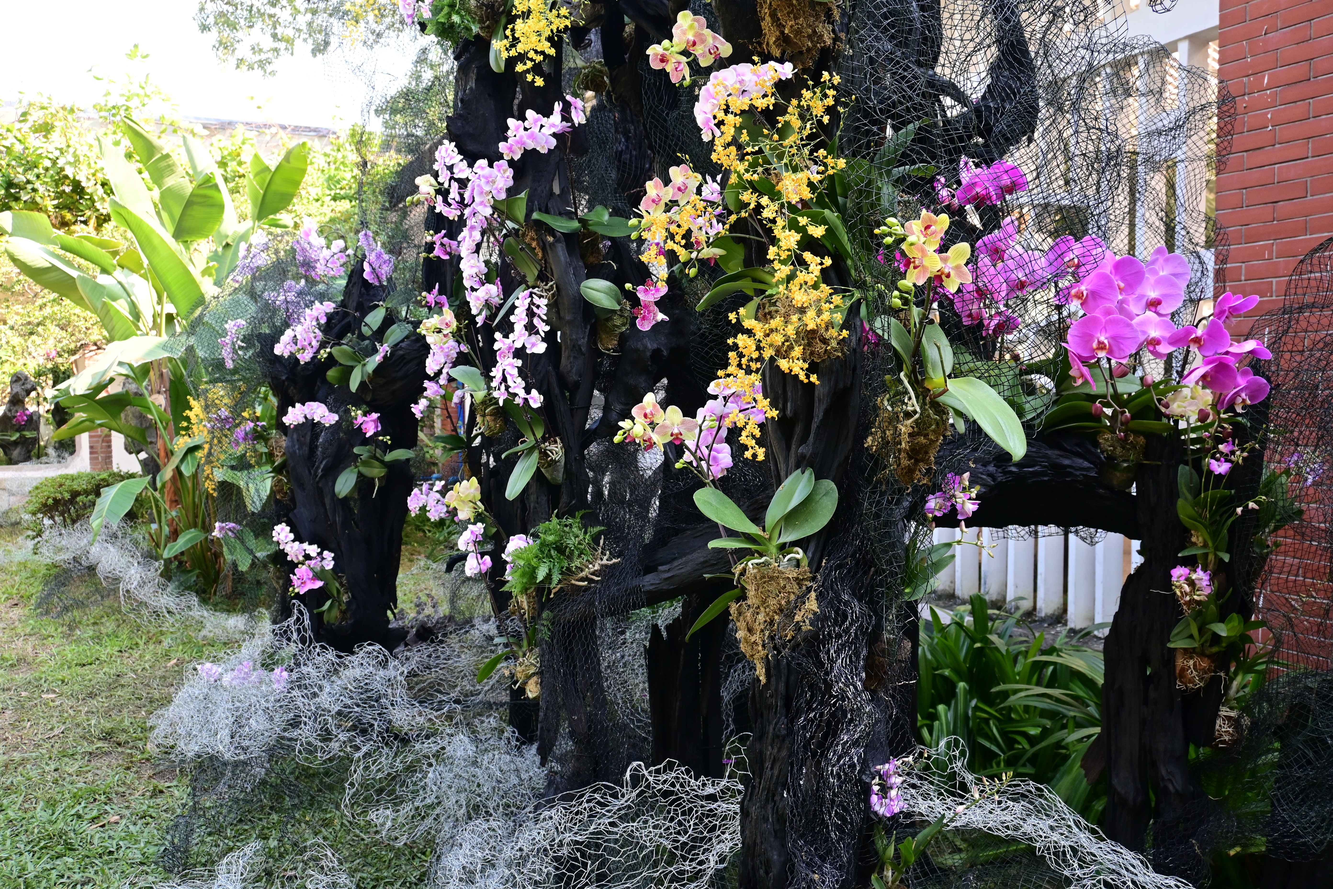 全国知名现代花艺大师黄仔首度为广州兰圃献艺,呈现最新作品《彼作见山》《彼作见水》,成为本次展览的最大亮点。《彼作见山》被放置兰棚外的大草坪上,作品通过火烧陈年木,创作出写意通透的山形,山中开满热情绚丽的热带兰花。奇特的是,山中“云雾”缭绕,披上轻纱幔帐,宛如“蝴蝶翩翩,舞动山间”的人间仙境,让驻足观赏的人们细细体味“见山是山,见山不是山,见山又是山”的内涵。