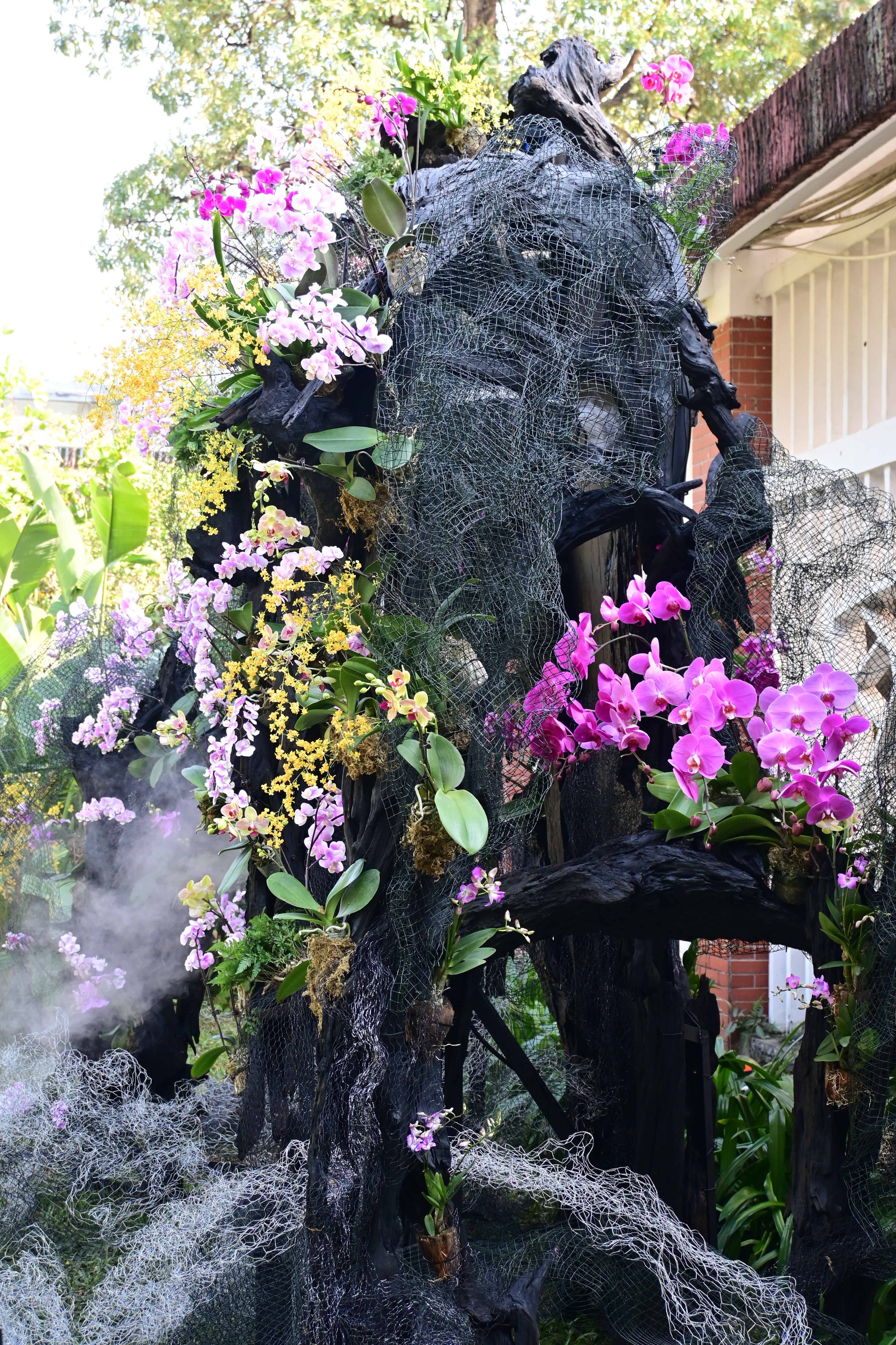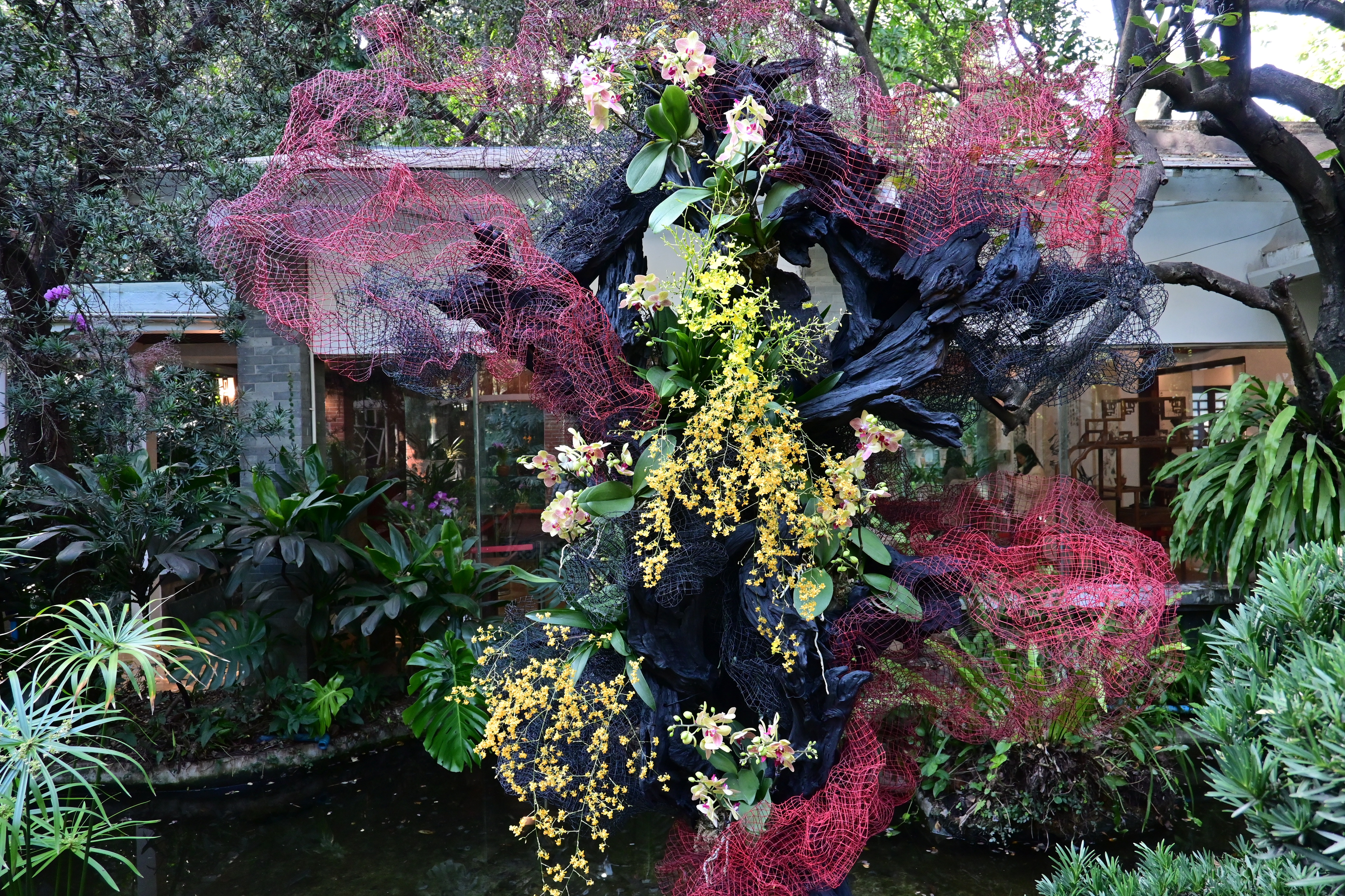 另一个作品《彼作见水》,被设置在国香馆外的溪流中。这里叠石流水,色彩斑斓的热带兰点缀其间,展现出“水石相映,石上生花,花水相融”的曼妙意境。