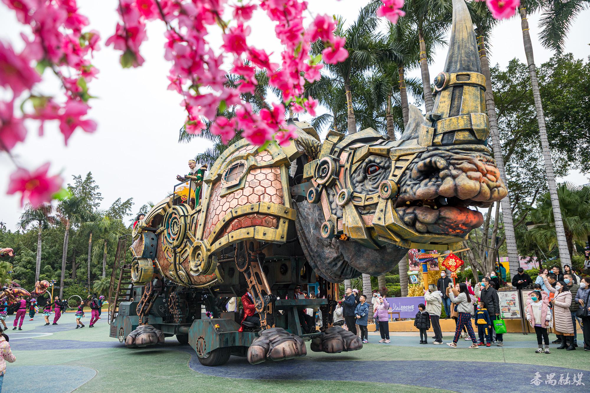 春节期间,长隆欢乐世界“贺岁版”机甲动物天团给大家拜年,游客可在园区观看超级动物机甲大巡游,感受浓浓的春节气氛。 “赤魔龙”“水牛神兽” “仿生巨蝎” “獠牙战车”“犀牛金刚”等超级动物机甲花车栩栩如生的动作配合振奋人心的音乐和演员精彩的表演,给游客带来沉浸式的欢乐游玩体验。