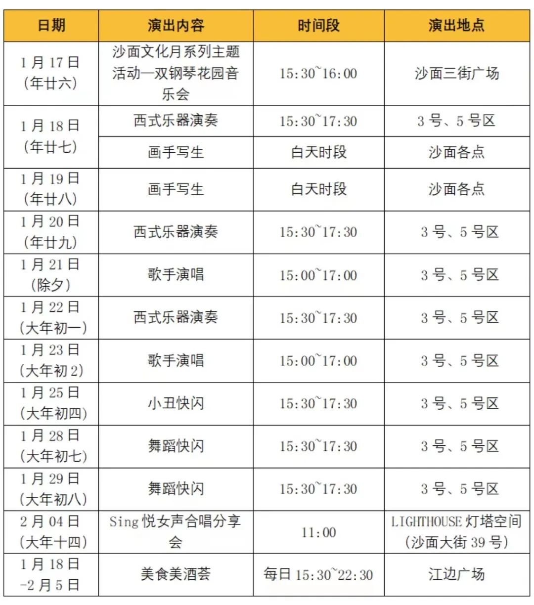 沙面一系列特色新春活动将密集上演,有欢乐的巡游表演、独具特色的车尾箱摊位、热闹的江畔潮酒集市,让新年出行变得有趣又难忘。