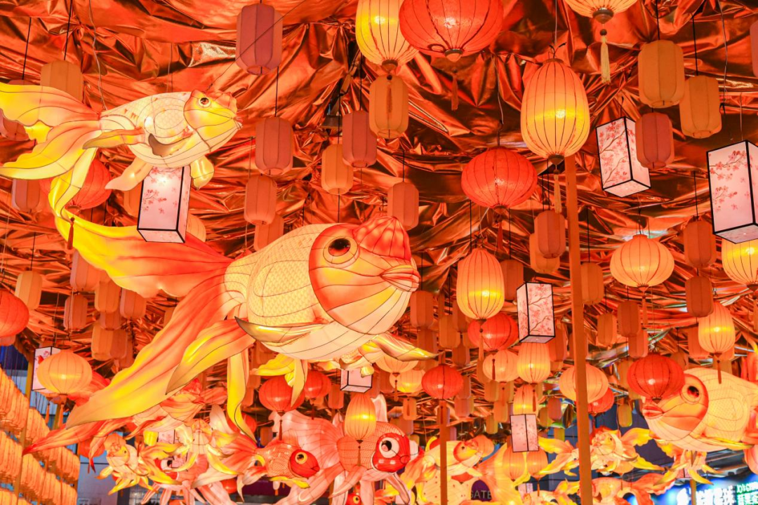 正佳广场上新了一场别具特色的“大唐千灯会”。活动联合火爆IP《唐宫夜宴》,复刻了唐都东西市盛景。门口的“一夜鱼龙舞”造景灯火璀璨,全场上千盏花灯,在春节假期带你“穿越”回唐朝。