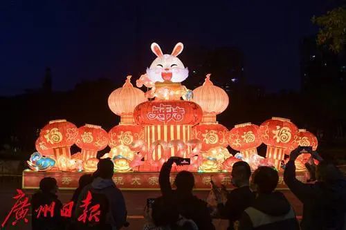 白天赏花,晚上观灯,越秀公园延续春节赏花灯的文化传统。正门、东门等主要门岗和园道,布置了数组新年氛围的大型彩灯,有高8米的开门大吉桔子树,有可爱的生肖兔,还有上百个灯笼打造的祝福长廊。
