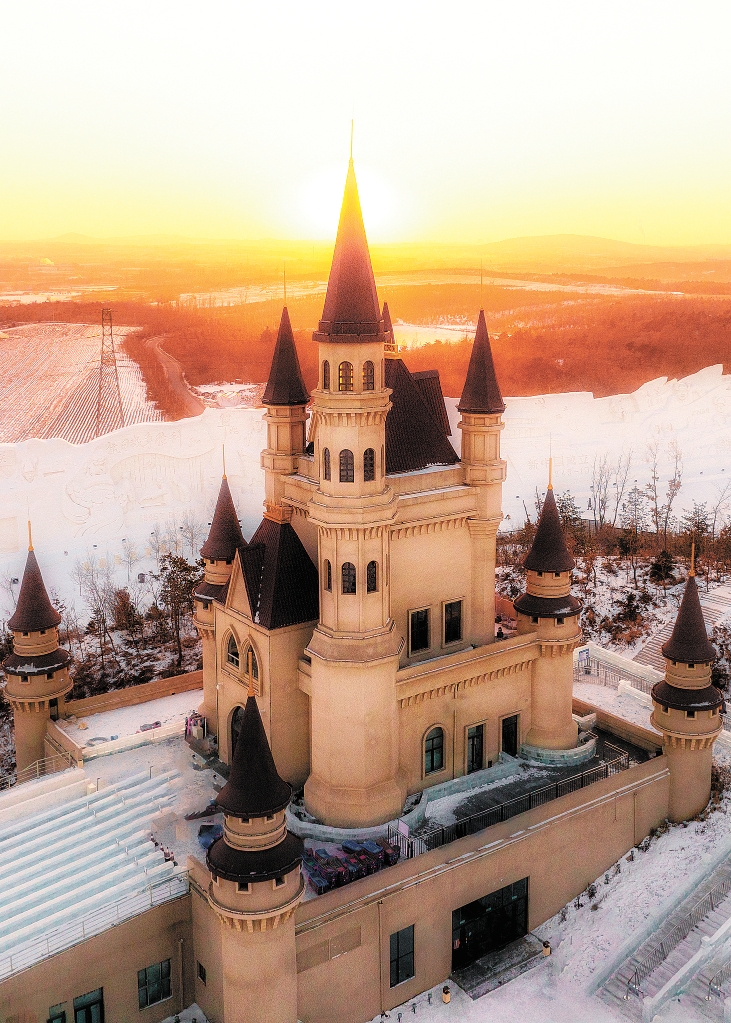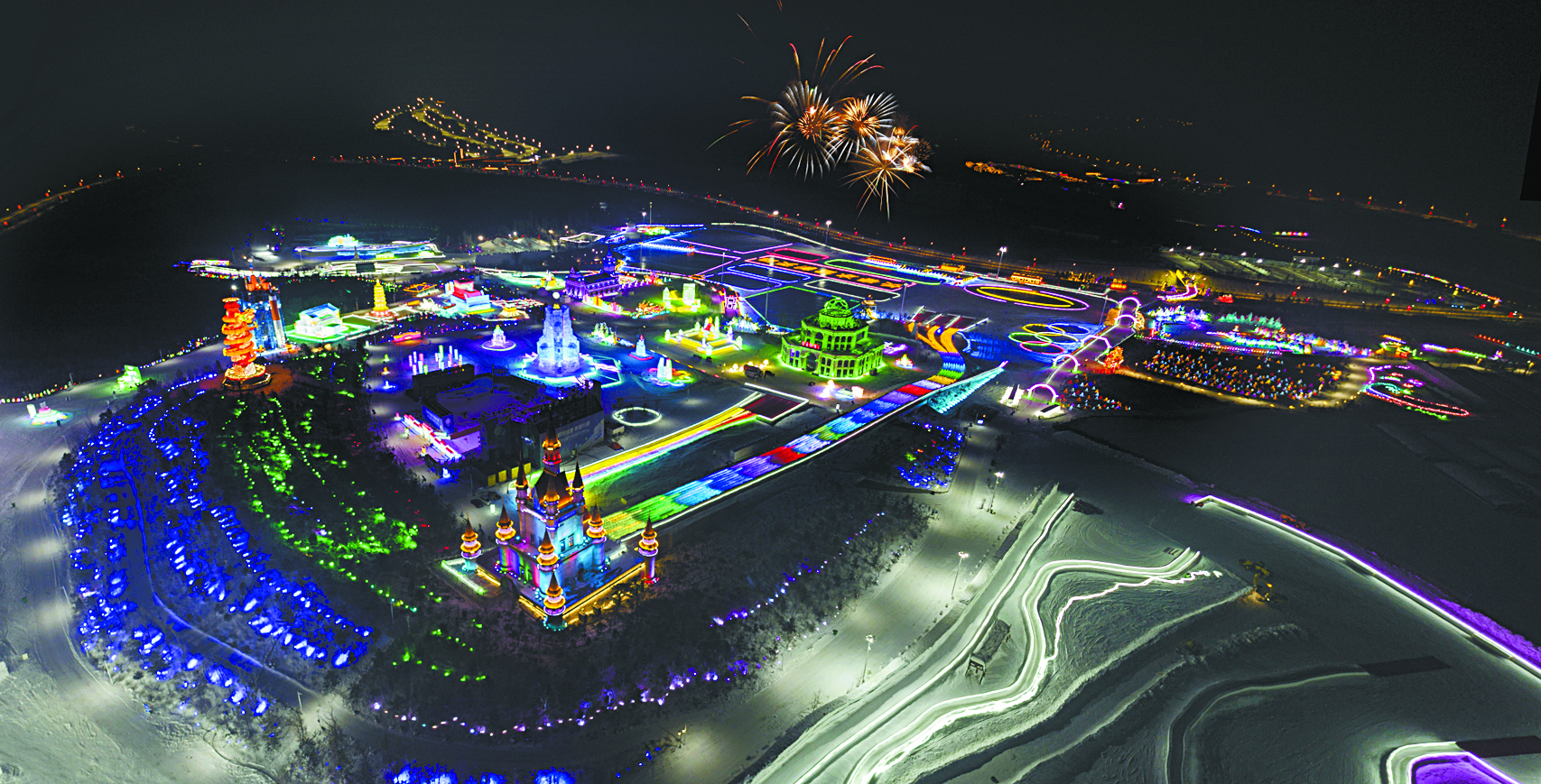 冰雪新天地今年的主题是“中华五千年 冰雪贺盛世”,用156万平方米规划了八大区域,以冰雪为载体展现五千年华夏文明,其中高39米的玉兔奔月主塔、全新造型的激情大滑梯是今年最佳看点。入夜,各个冰雪景区就变身为瑰丽的冰雪童话世界,各种造型的冰雕建筑流光溢彩,璀璨夺目。