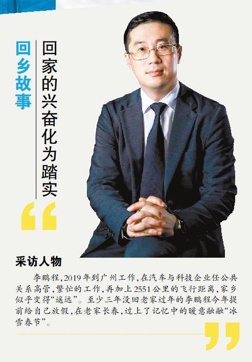 “一直在外面工作,算一算,我和爱人是真的三四年没有回长春过年了,去年春节也是在广州过的。我们今年提前回到了长春,刚踏上乡土的时候,熟悉的乡音、走过的街道就在耳边、眼前,所有出发前的期盼、兴奋都化为了心里的‘踏实’。回去后,我们第一时间就把双方的父母都接来家里了,还叫上了姐姐和爱人妹妹一家子,大家都热热闹闹聚在我家里一起吃饭,过年假期的七天尽量一起过”。