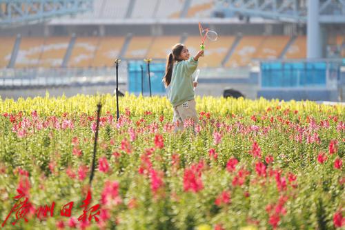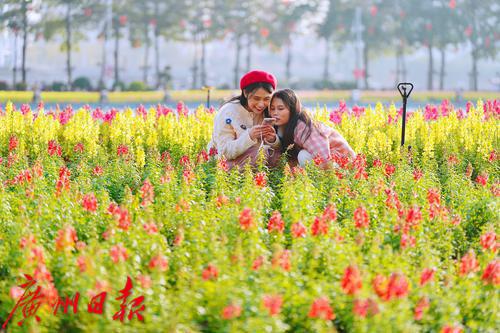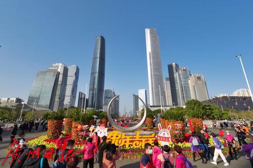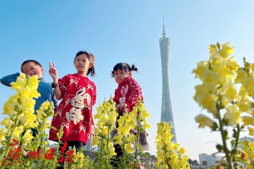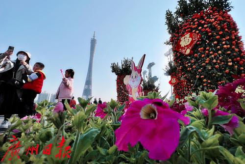 2023年1月24日,大年初三,广州阳光灿烂万里无云,市内各大公园花海花境惹人醉,迎来大量的市民游客。花城广场和海心沙亚运公园的的新年花境成了市民游客拍照留影的打卡点。