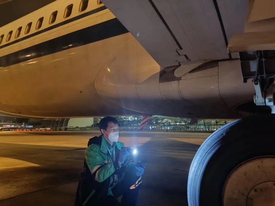 每架飞机停靠时,“飞机医生”们都需要对其进行例行检查,白云机场地勤公司日均代理210余架短停飞机和70余架过夜飞机,每架飞机检查时间也不相同,短则30分钟,长则2个小时。