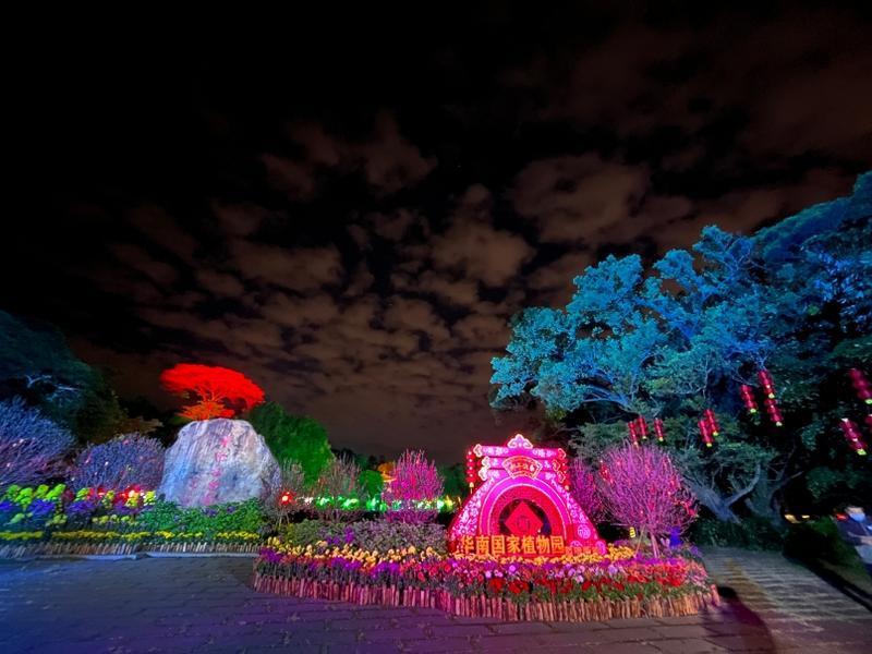 今年春节、元宵节期间,华南国家植物园部分区域试行延时开放,游人既可夜游热带雨林景观,又可在夜幕降临后,观赏到园内为渲染节日氛围的景观灯饰,不同色彩的灯光聚成一片,就像一簇簇放射着灿烂光华的各式鲜花造型。