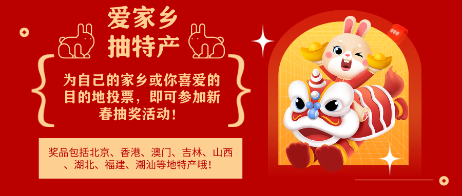 在“回家”这一趟旅程中,那些团圆的场景、动人的瞬间、温馨的叮嘱,都会在您心中种下家的专属温馨。点击下图链接,上传分享那些感动的瞬间(文字、图片和视频均可),并投票为您家乡打call,选出你喜爱的城市和地区。分享和投票成功后就可以参加抽奖,有机会赢得多地特色年货、特产等礼品。