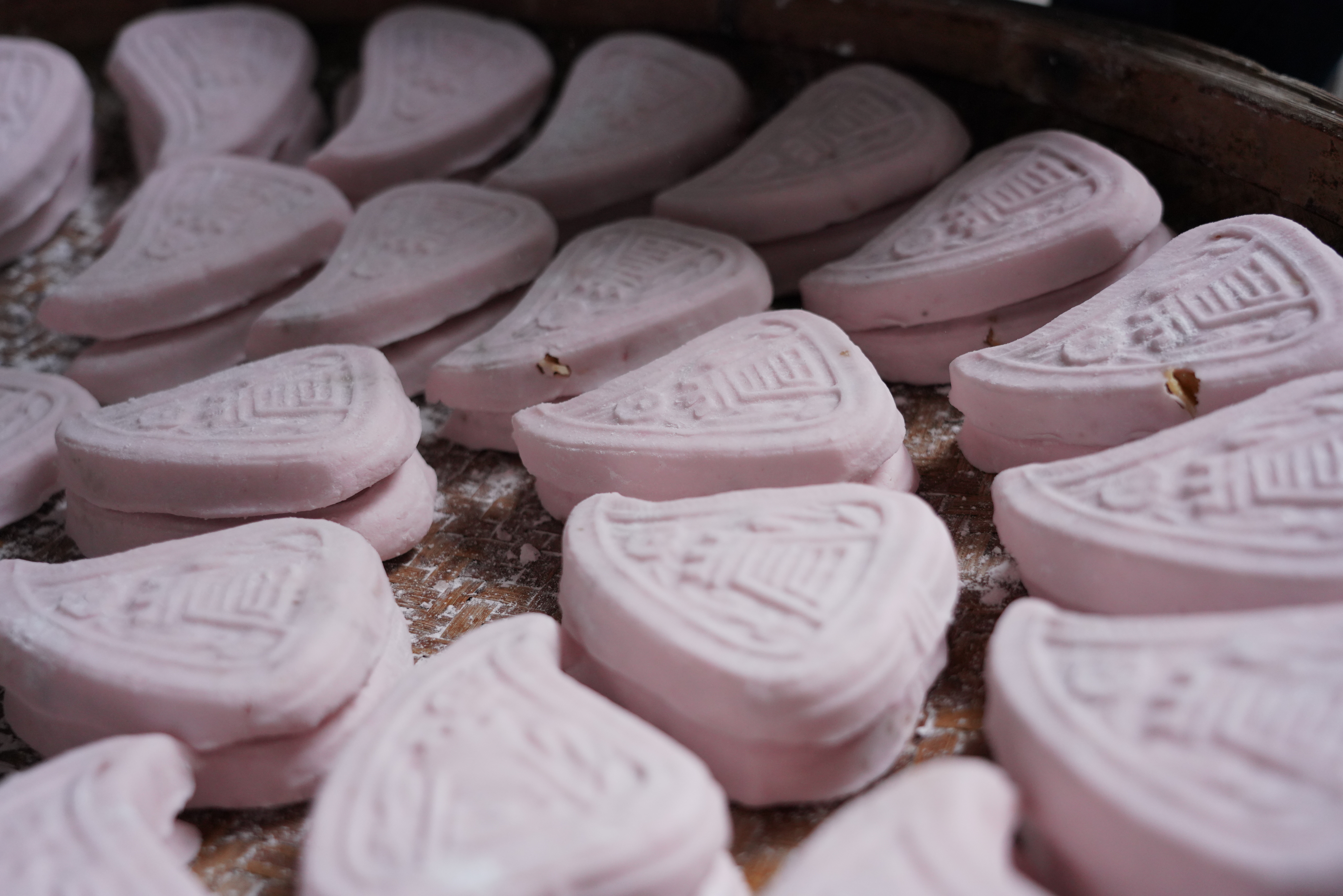 鼠曲粿、红桃粿、甜粿、白粿、酵粿、肚兜粿、菜头粿……年前的粿品丰富得很。粿品里满载的是当地百姓对来年好日子的期望。比如酵粿,又叫“发粿”,有发家发财的好寓意,人们将它做得很大,甚至有几十斤重的“大发”,这粿是用米粉发酵做成的。最喜庆的莫过于红桃粿,其因外形酷似桃子造型而得名,有长寿吉祥之意。鼠曲粿也多数做成桃状,它的名号源于粿品中的主要食材“鼠曲”。这是一种青草药,遍布于潮汕乡村的菜园里、田埂上。潮汕人将鼠曲草晒干后舂成粉状,揉成泥状,与米粞混合在一起做成粿皮,里头包裹的馅有甜有咸。不同于红桃粿的粉红粿皮,鼠曲粿的皮是黑褐色的,用油煎热后能产生古人称之为“鼠耳香”的香气。如今,这些粿品也成了小吃,能在街头巷尾的小食店里吃上。