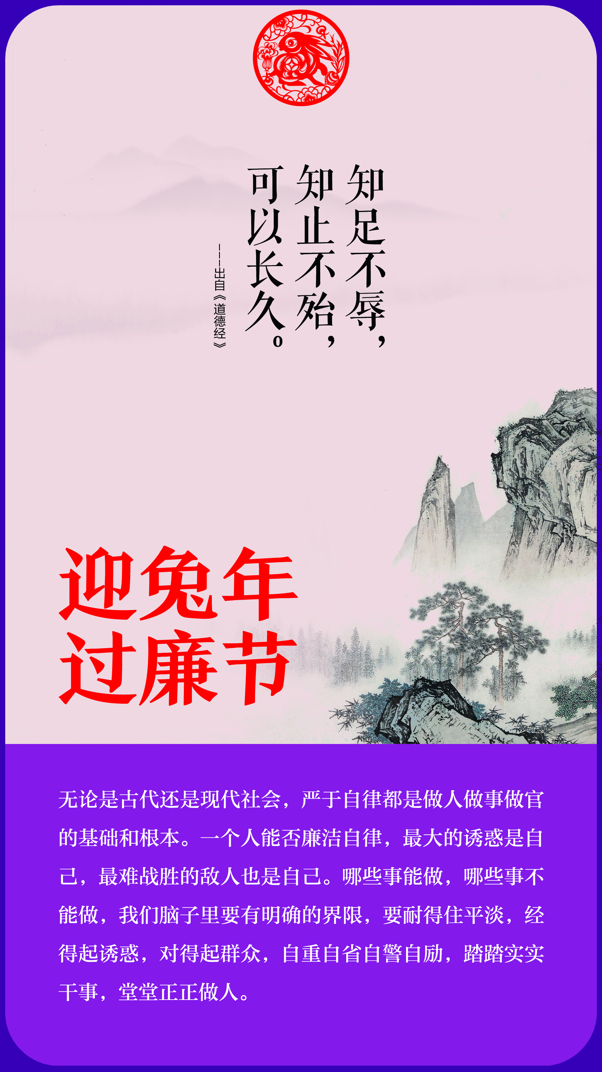 “知足不辱,知止不殆,可以长久。”出自《道德经》第四十四章。意为:懂得知足就不会受到屈辱,懂得适可而止就不会遇到危险,这样才可以长久的平安。以此告诫世人要有知足之心,做事适可而止。