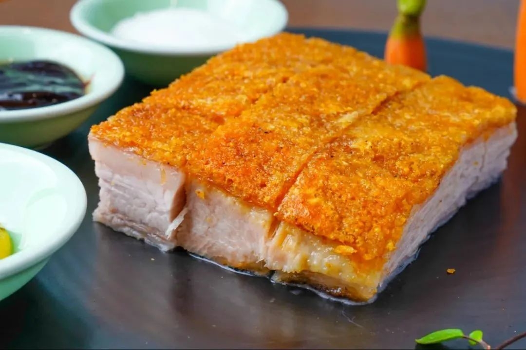 金黄色的表皮酥脆诱人,皮下肥瘦相间,宛若凝脂。搭配特调蘸料:黄芥末酱、澳门秘制酱、白砂糖,口感层层递进,每一口都有惊喜。