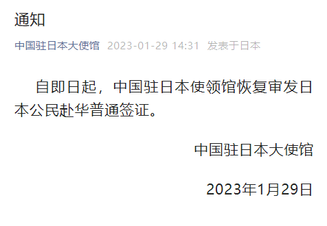 据中国驻日本大使馆29日消息,自即日起,中国驻日本使领馆恢复审发日本公民赴华普通签证。