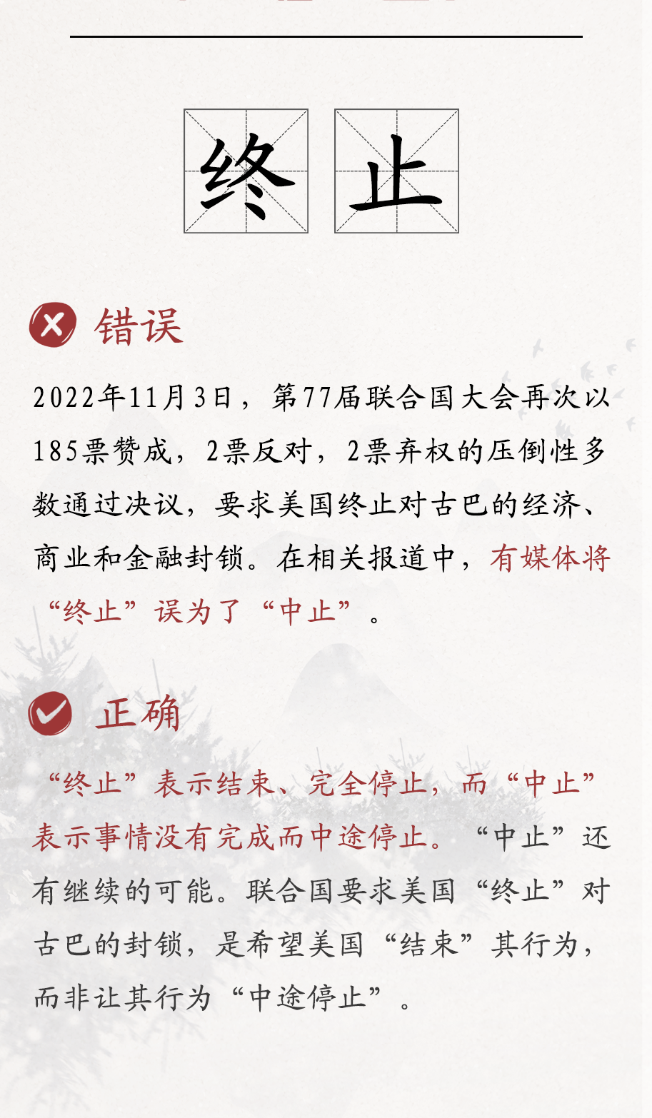 在相关报道中,有媒体将“终止”误为了“中止”。“终止”表示结束、完全停止,而“中止”表示事情没有完成而中途停止。“中止”还有继续的可能。