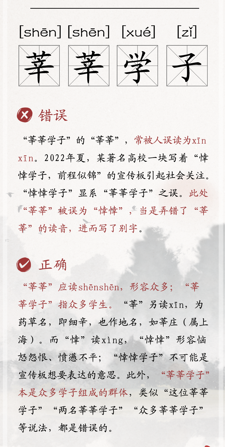 10“莘莘学子”的“莘莘”误读为xīnxīn