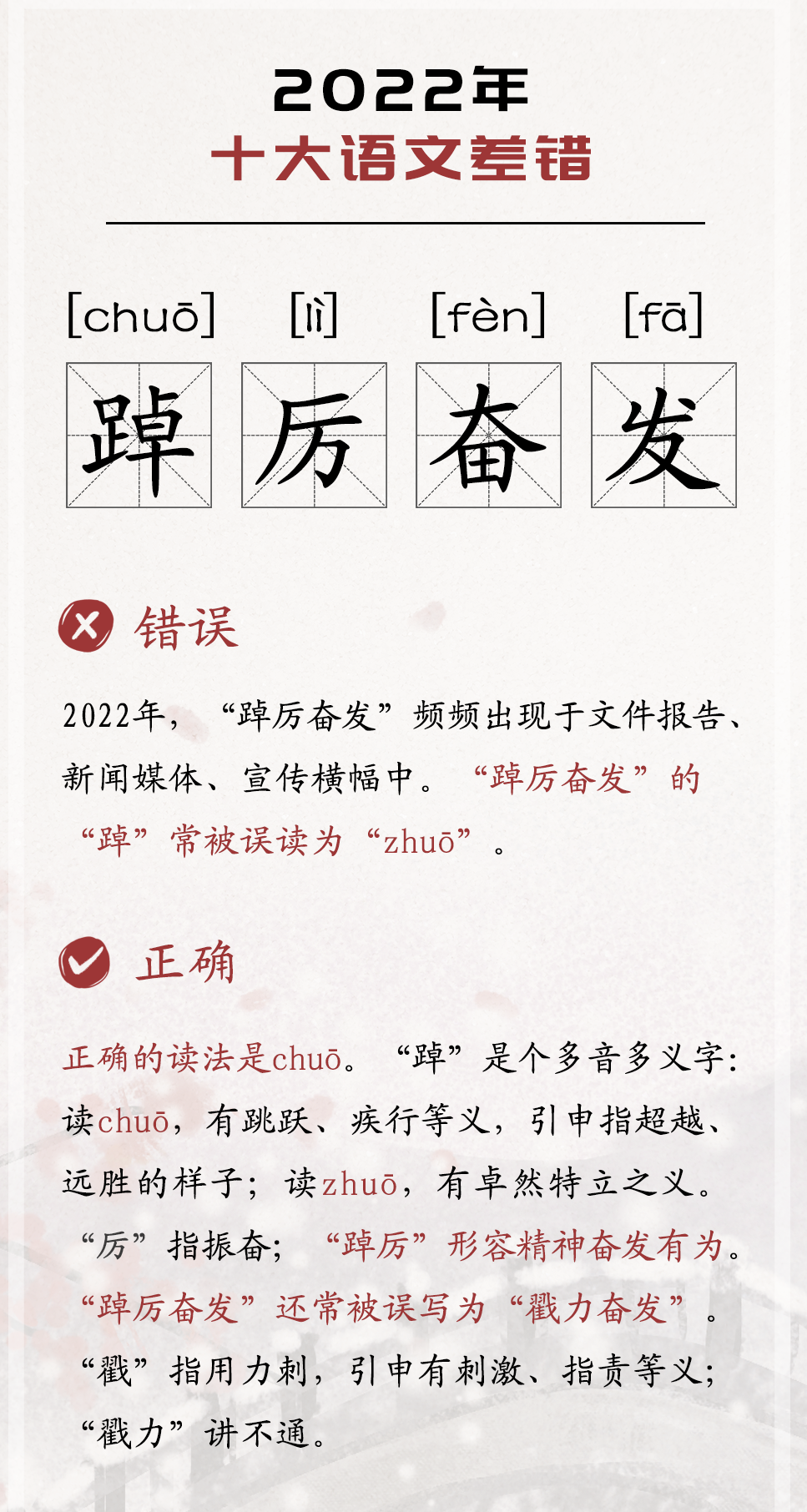 2022年,“踔厉奋发”频频出现于文件报告、新闻媒体、宣传横幅中。“踔厉奋发”的“踔”常被误读为“zhuō”,正确的读法是chuō。“踔”是个多音多义字:读chuō,有跳跃、疾行等义,引申指超越、远胜的样子;读zhuō,有卓然特立之义。“厉”指振奋;“踔厉”形容精神奋发有为。“踔厉奋发”还常被误写为“戳力奋发”。“戳”指用力刺,引申有刺激、指责等义;“戳力”讲不通。