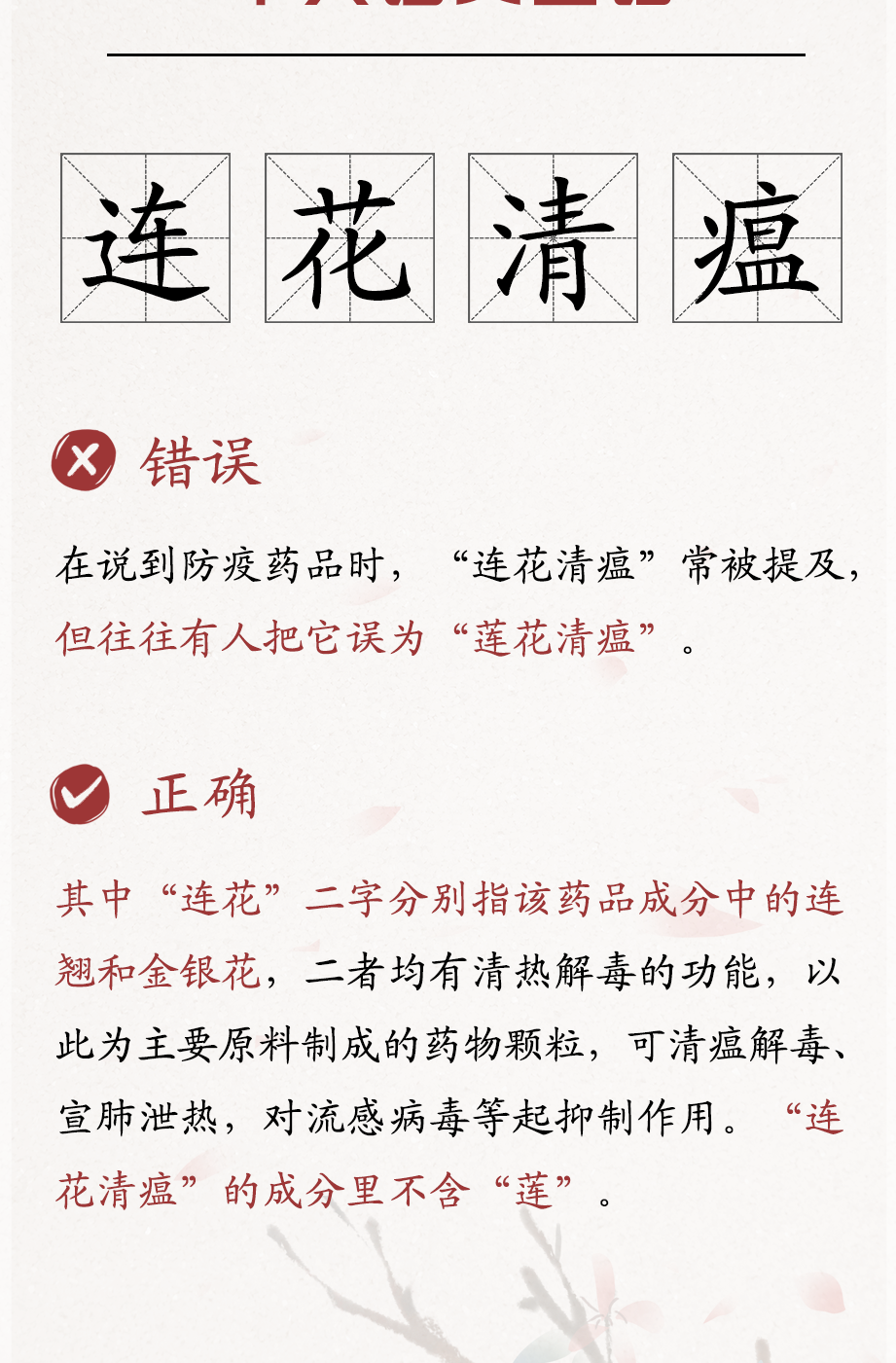 在说到防疫药品时,“连花清瘟”常被提及,但往往有人把它误为“莲花清瘟”。其中“连花”二字分别指该药品成分中的连翘和金银花,二者均有清热解毒的功能,以此为主要原料制成的药物颗粒,可清瘟解毒、宣肺泄热,对流感病毒等起抑制作用。“连花清瘟”的成分里不含“莲”。