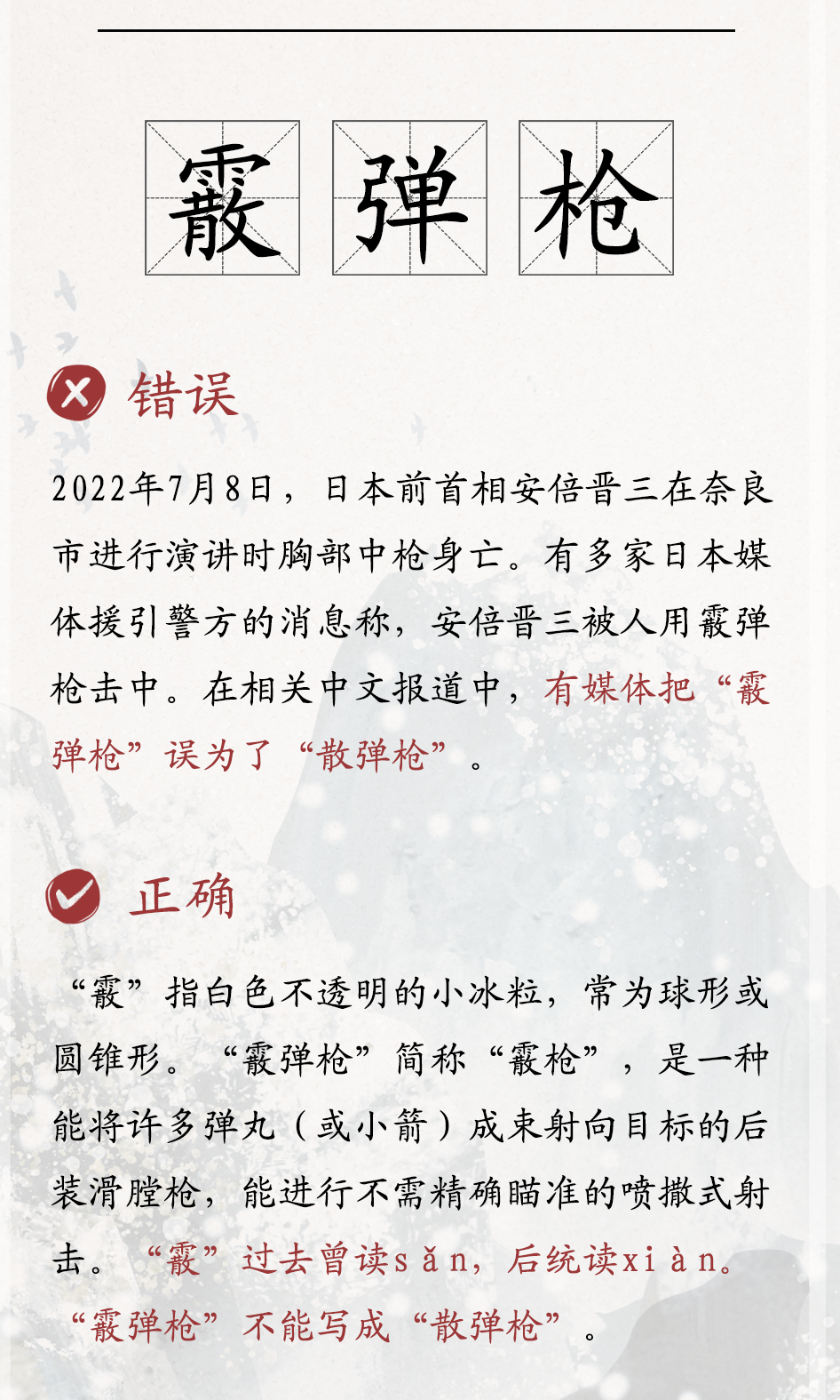 “霰”指白色不透明的小冰粒,常为球形或圆锥形。“霰弹枪”简称“霰枪”,是一种能将许多弹丸(或小箭)成束射向目标的后装滑膛枪,能进行不需精确瞄准的喷撒式射击。“霰弹枪”不能写成“散弹枪”。