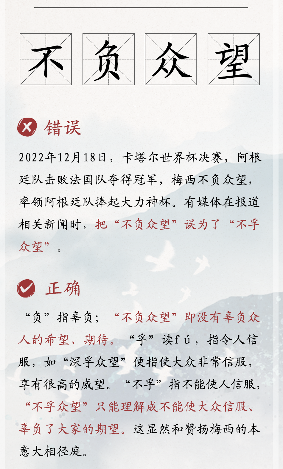 2022年12月18日,卡塔尔世界杯决赛,阿根廷队击败法国队夺得冠军,梅西不负众望,率领阿根廷队捧起大力神杯。有媒体在报道相关新闻时,把“不负众望”误为了“不孚众望”。“负”指辜负;“不负众望”即没有辜负众人的希望、期待。“孚”,指令人信服,如“深孚众望”便指使大众非常信服,享有很高的威望。“不孚”指不能使人信服,“不孚众望”只能理解成不能使大众信服、辜负了大家的期望。这显然和赞扬梅西的本意大相径庭。