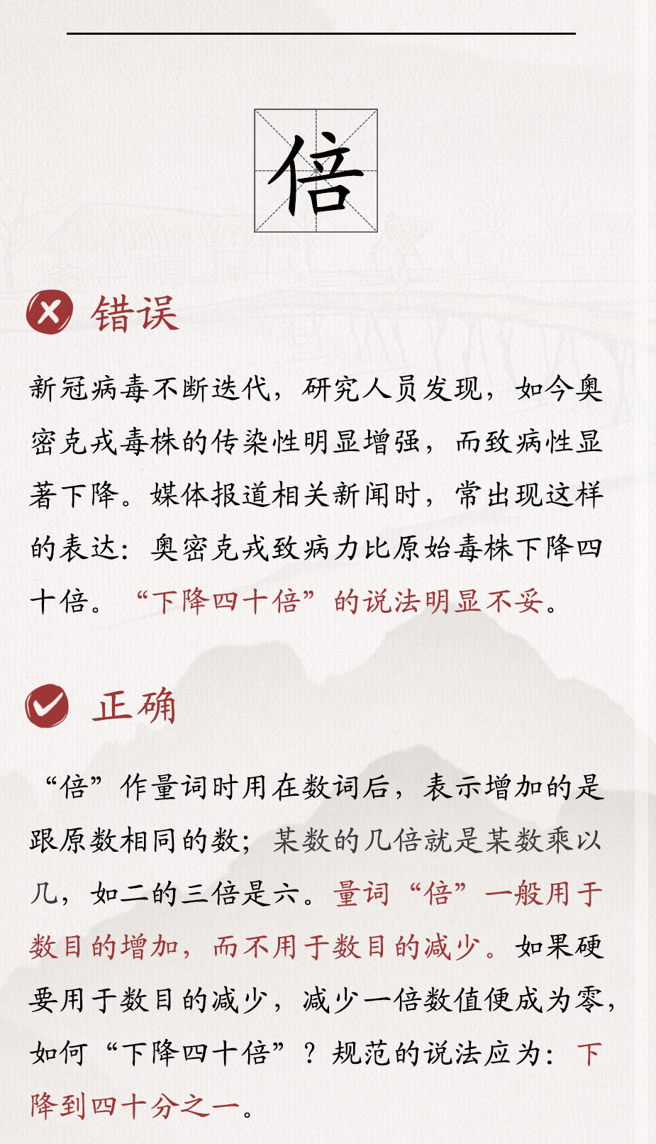 媒体报道相关新闻时,常出现这样的表达:奥密克戎致病力比原始毒株下降四十倍。“下降四十倍”的说法明显不妥。“倍”作量词时用在数词后,表示增加的是跟原数相同的数;某数的几倍就是某数乘以几,如二的三倍是六。量词“倍”一般用于数目的增加,而不用于数目的减少。如果硬要用于数目的减少,减少一倍数值便成为零,如何“下降四十倍”?规范的说法应为:下降到四十分之一。
