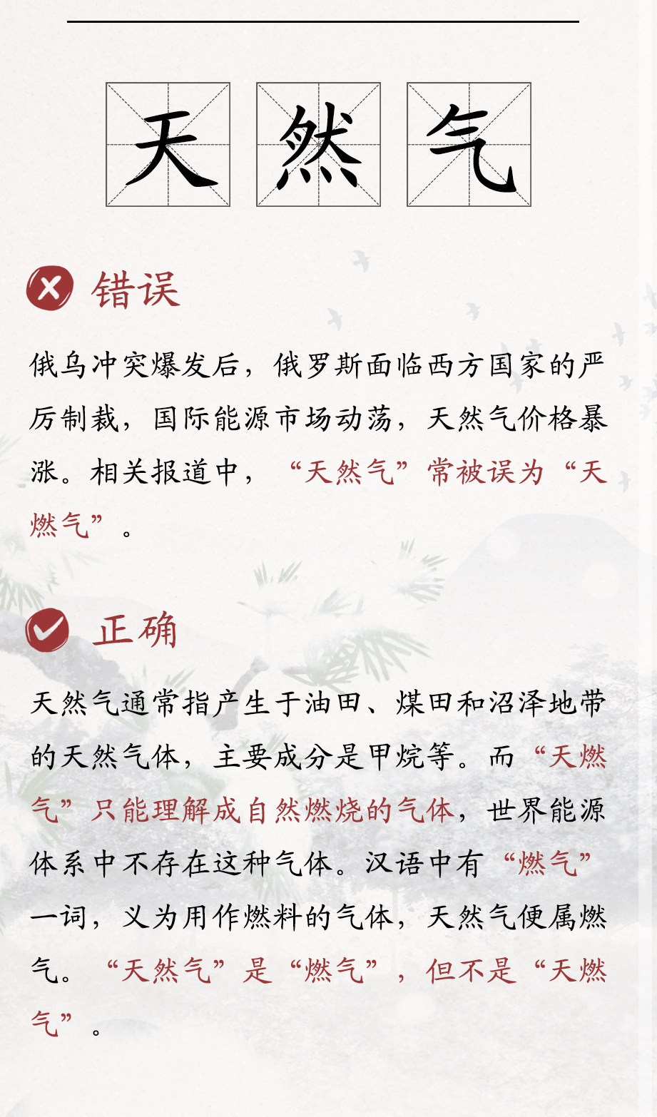 国际能源市场动荡,天然气价格暴涨。相关报道中,“天然气”常被误为“天燃气”。天然气通常指产生于油田、煤田和沼泽地带的天然气体,主要成分是甲烷等。而“天燃气”只能理解成自然燃烧的气体,世界能源体系中不存在这种气体。汉语中有“燃气”一词,义为用作燃料的气体,天然气便属燃气。“天然气”是“燃气”,但不是“天燃气”。