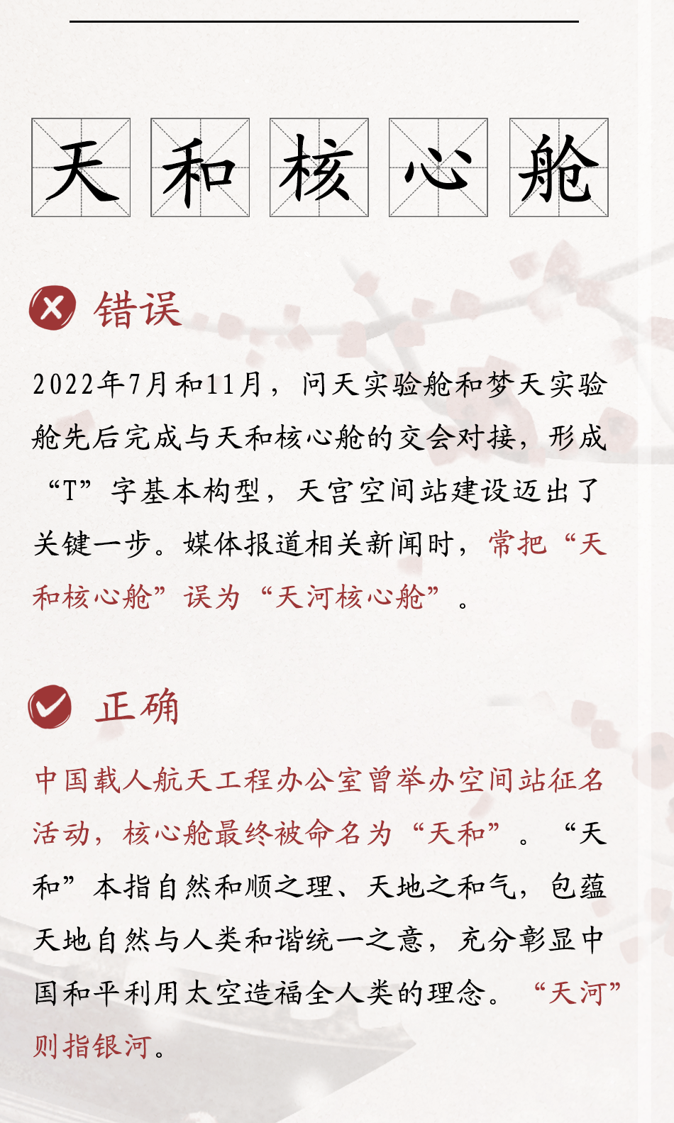 2022年7月和11月,问天实验舱和梦天实验舱先后完成与天和核心舱的交会对接,形成“T”字基本构型,天宫空间站建设迈出了关键一步。媒体报道相关新闻时,常把“天和核心舱”误为“天河核心舱”。中国载人航天工程办公室曾举办空间站征名活动,核心舱最终被命名为“天和”。“天和”本指自然和顺之理、天地之和气,包蕴天地自然与人类和谐统一之意,充分彰显中国和平利用太空造福全人类的理念。“天河”则指银河。