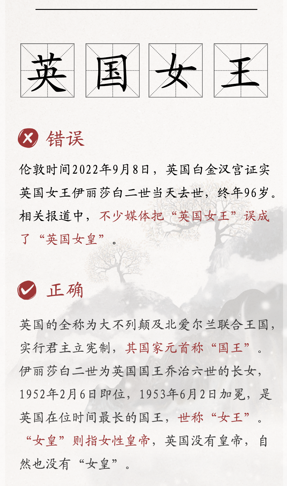 伦敦时间2022年9月8日,英国白金汉宫证实英国女王伊丽莎白二世当天去世,终年96岁。相关报道中,不少媒体把“英国女王”误成了“英国女皇”。英国的全称为大不列颠及北爱尔兰联合王国,实行君主立宪制,其国家元首称“国王”。伊丽莎白二世为英国国王乔治六世的长女,1952年2月6日即位,1953年6月2日加冕,是英国在位时间最长的国王,世称“女王”。“女皇”则指女性皇帝,英国没有皇帝,自然也没有“女皇”。